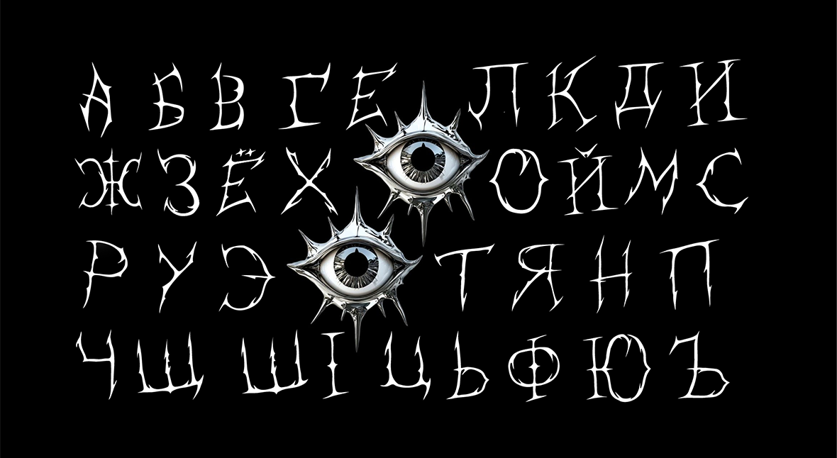 Dans ce projet, j’ai créé une typographie décorative de l’alphabet cyrillique, inspirée du cybersigilism. J’ai voulu mêler symboles, formes organiques et tracés presque mystiques pour créer une écriture à la fois numérique et ésotérique.